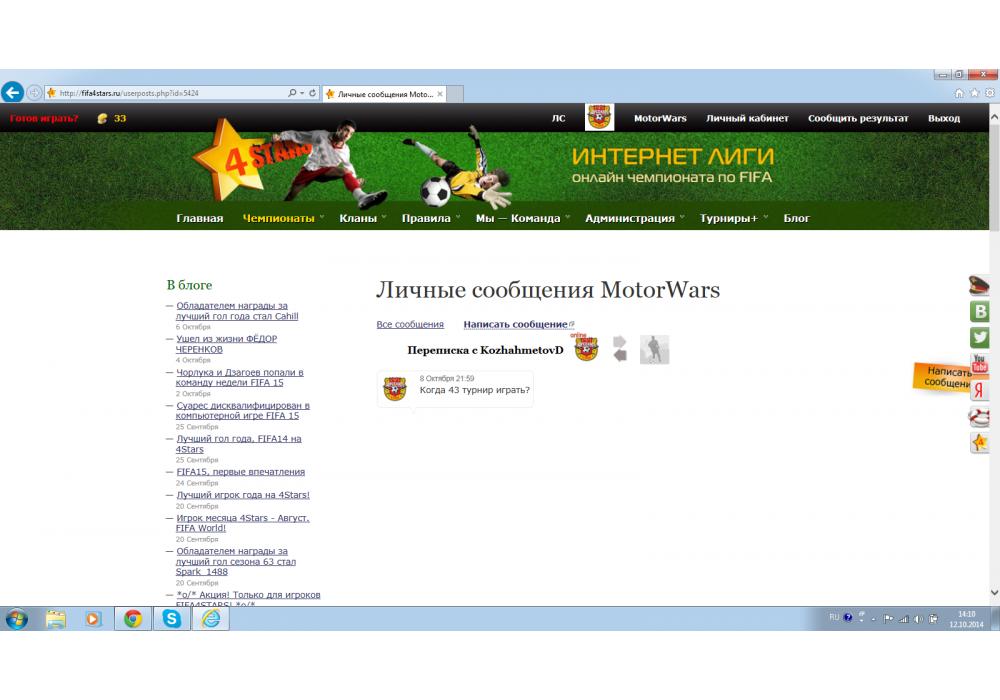 MotorWars vs KozhahmetovD турнир FIFA World Cup-43 4Stars Игра заявлена 12 Октября 2014 (#187948) | ||||||||||||||||||||||||||||||||||
