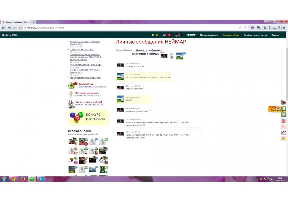 НЕЙМАР vs loko395 Кубок чемпионата FW Игра заявлена 16 Апреля 2015 (#269407) | ||||||||||||||||||||||||||||||||||