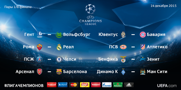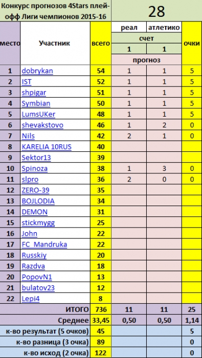 1 тур - 1/8 финала 1 матч 2 тур - 1/8 финала 2 матч 3 тур - 1/4 финала 1 матч 4 тур - 1/4 финала 2 матч 5 тур - 1/2 финала 1 матч 6 тур - 1/2 финала 2 матч 7 тур - финал Числа матчей будут сообщены дополнительно Расписание матчей Плей-офф Лига чемпионов УЕФА 2015/2016 Расписание турнира: финал - 28 мая Время московское* Все прогнозы участников после их отправки арбитру будут выставлены на обозрение перед началом игр тура. Желающие поучавствовать в конкурсе могут до тура сделать свой прогноз по счету этих игр и ждать результатов тура. Далее по итогам прогнозов и реального счета подсчитываем заработанные очки и делаем прогноз на следующий тур конкурса. Арбитр конкурса - Spinoza Внимание! Прогнозы на все матчи тура участники обязаны выслать арбитру конкурса в ЛС , не позднее чем за 5 часов до начала 1 матча тура. Прием заявок ЗАВЕРШЕН! ВЫСЫЛАЕМ ПРОГНОЗЫ арбитру конкурса! Внимание! Подав заявку отозвать её невозможно! Думайте чем принять решение. Если человек подал заявку и "забыл" про конкурс, вложенные средства не возвращаются. По возможности, по окончании тура конкурса прогнозов , итоги будут анонсированы в блоге портала.