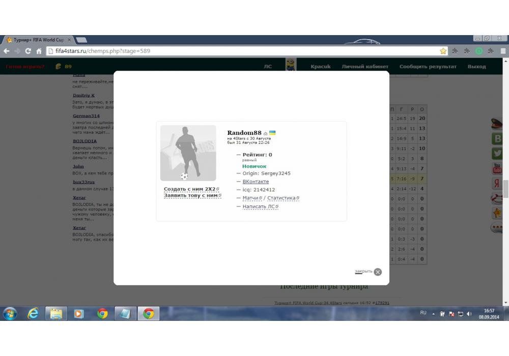Kpacuk vs Random88 Турнир+ FIFA World Cup-34 4Stars Игра заявлена 8 Сентября 2014 (#179308) | ||||||||||||||||||||||||||||||||||