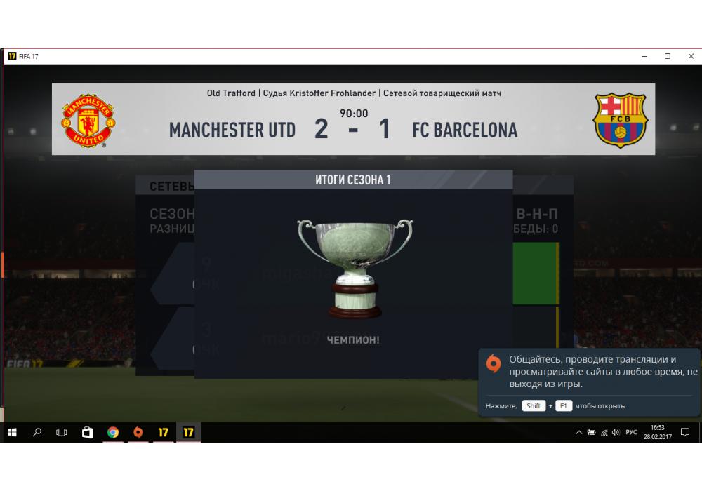 Manchester Utd. vs FC Barcelona Open Ladder 1х1 4Stars FIFA17 PС Игра заявлена 28 Февраля 2017 (#513471) | ||||||||||||||||||||||||||||||||||