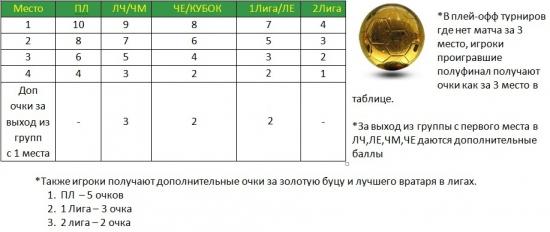 Примечание* Левый столбец- занятые места игроками в сезоне, Правый столбец- Турниры сезона. Так же Обладатель Золотого мяча может быть определен с помощью голосования или на усмотрение администрации. Разъяснения по снятиям и вступлению в лиги ряда участниковВсе игроки подавшие заявку на участие в основном чемпионате автоматически идут в низшую лигу, где они и начнут своё участие.Игрок может начать играть и с 3й лиги, минуя 4ю лигу (при её наличии), при условии: